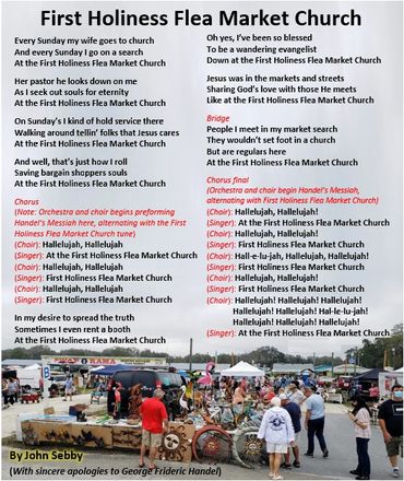 (Note: Orchestra and choir begins preforming Handel’s Messiah here, alternating with the First Holiness Flea Market Church tune)